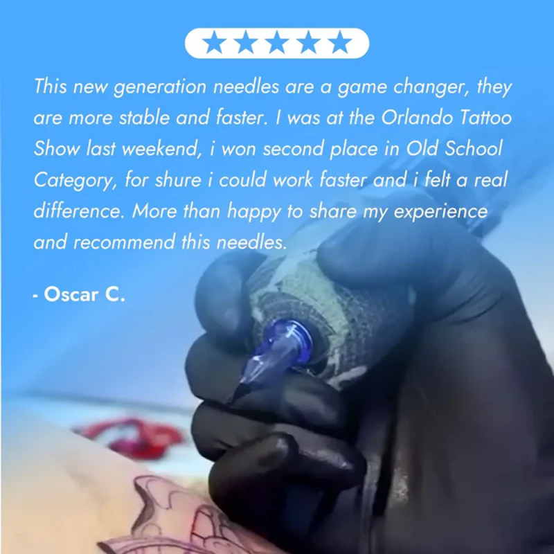 Pevnější konstrukce přispívá k klidnějšímu průběhu při proceduře. Jehly jsou až 2× odolnější než běžné a lépe drží tvar. Barevné provedení usnadňuje rychlou orientaci ve výbavě. Díky tomu je to skvělá volba pro umělce, kteří střídají různé styly a chtějí jistotu v každém kroku.