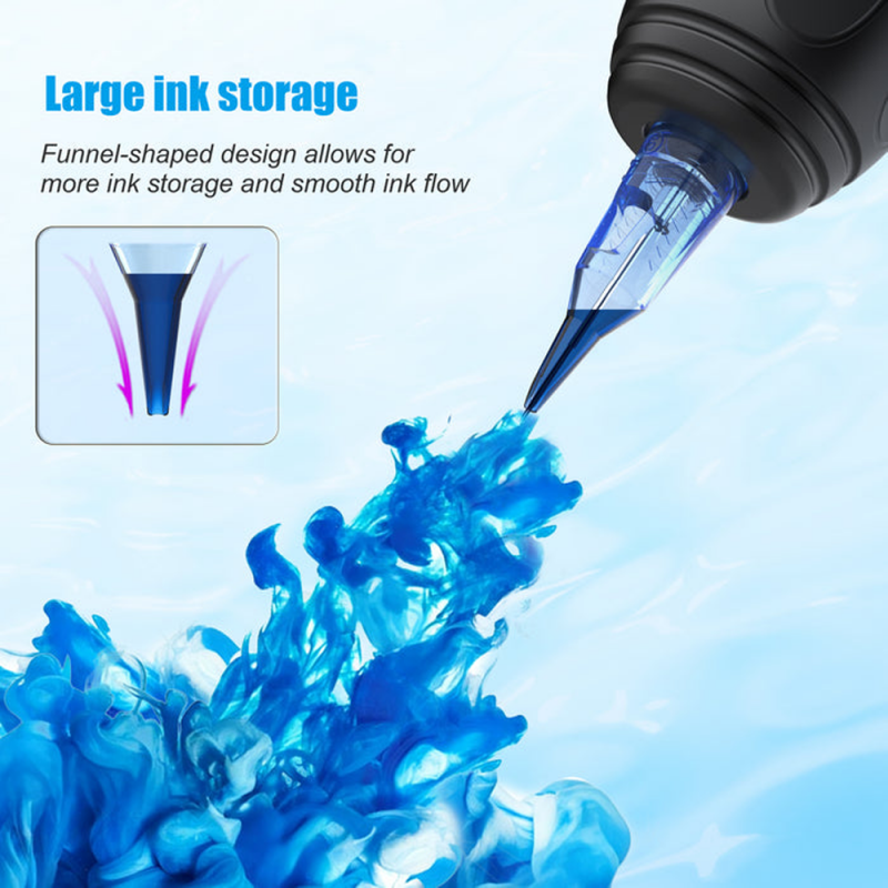 - velký zásobník – umožňuje tetovat déle bez častého doplňování inkoustu