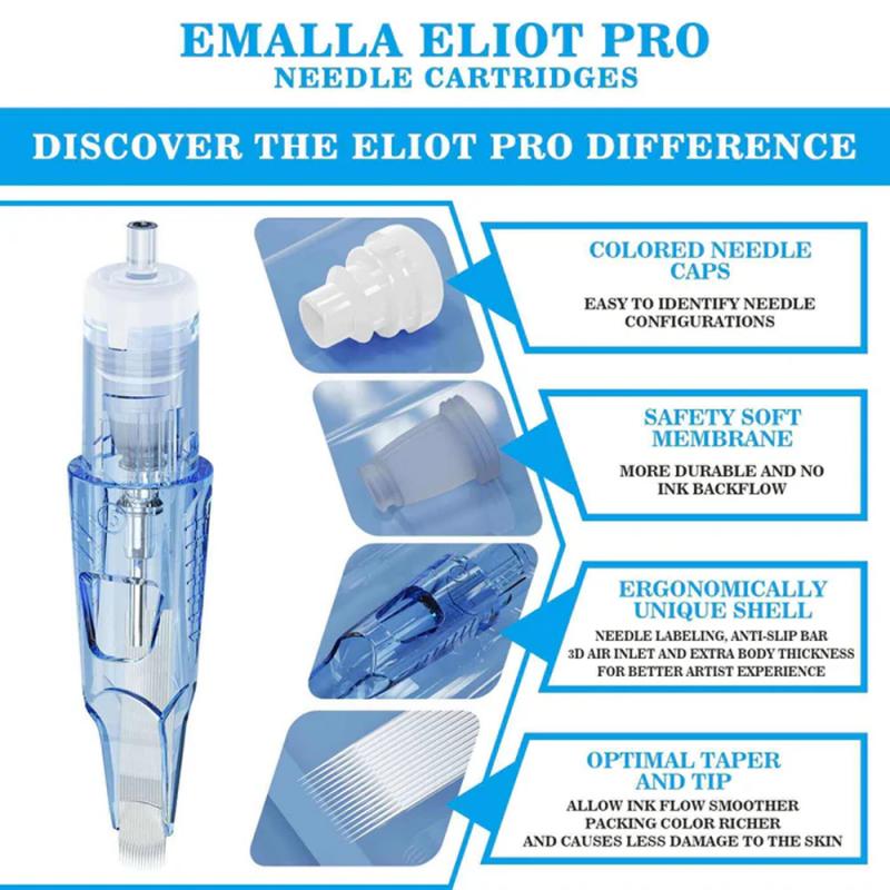 Řada Emalla Eliot Pro Liner 3 je určená pro tatéry, kteří potřebují jistotu při jemném linkování a konzistentní výsledek i u detailních motivů. Úzká špička podporuje kontrolované vedení tahu a přispívá k rovnoměrnému toku barvy. Je vybavená 3vrstvou bezpečnostní membránou, která brání zpětnému zatečení inkoustu do gripu a strojku. Jehla z medicínské nerezové oceli je navržena pro delší sezení a je méně náchylná k ohnutí. Dostupné konfigurace umožňují zvolit provedení podle požadované síly linky a stylu tetování.