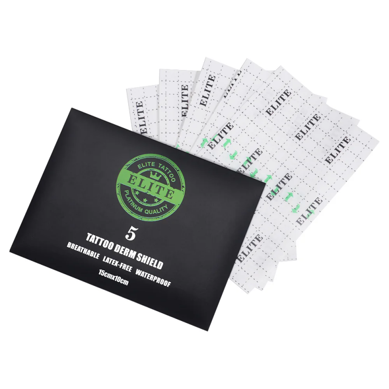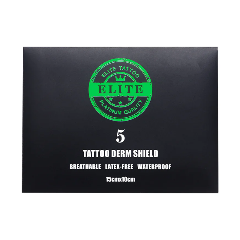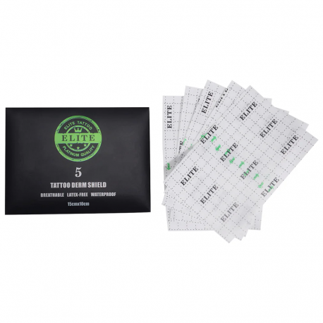 Elite Premium Derm Shield je transparentní samolepicí fólie určená k překrytí čerstvého tetování po dokončení práce. Slouží jako praktické řešení pro první fázi péče o pokožku, kdy je důležité udržet ošetřovanou oblast zakrytou a chráněnou před nečistotami, bakteriemi a třením při běžném fungování klienta. Varianta v předřezaných kusech umožňuje použití bez nutnosti stříhání a je vhodná zejména pro menší designy.