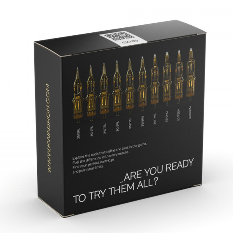 Značka Kwadron patří mezi nejuznávanější jména v tetovacím průmyslu a její produkty používají tisíce profesionálů po celém světě. Jejich tetovací cartridge jsou vyráběny s důrazem na přesnost a stabilitu. Jehly jsou dokonale ostré, pevně fixované a sterilně balené, takže tatér má při práci jistotu bezpečnosti i hygieny. Komfortní tvar cartridgů snižuje únavu rukou při dlouhých sezeních a univerzální kompatibilita zajistí, že je využijete ve většině běžných tetovacích strojů.
