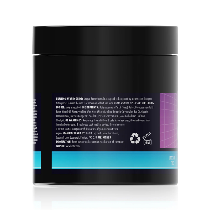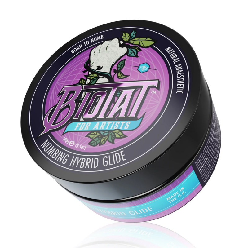 Biotat® Hybrid je přírodní znecitlivující krém určený pro tatéry, specialisty na PMU (Permanent Makeup) a SMP (Scalp Micropigmentation), stejně jako pro všechny, kteří upřednostňují šetrnou péči. Jeho přirozeně světlá barva, jemná vůně hřebíčku a bohatá máslová textura vytváří výjimečně hladký pocit. Používá se během tetování, pomáhá snižovat zarudnutí a napětí pokožky. Lze jej aplikovat také ihned po dokončení práce – pro zklidnění a dokonalé zakončení.