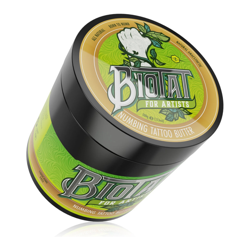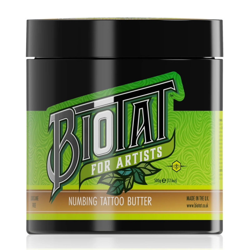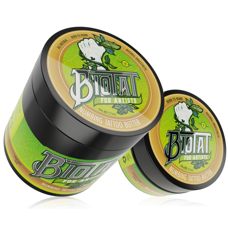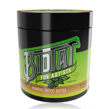 Biotat® Tattoo Butter je přírodní znecitlivující maslo určené pro tatéry, specialisty na PMU (Permanent Makeup) a SMP (Scalp Micropigmentation), stejně jako pro všechny, kteří upřednostňují šetrné řešení. Díky své čiré konzistenci umožňuje lepší viditelnost pigmentu a přesnější práci, zatímco bohatá máslová textura s obsahem bambuckého másla, hřebíčkového a levandulového oleje poskytuje výživu a ochranu. Používá se v průběhu tetování, udržuje pokožku hydratovanou a pružnou.