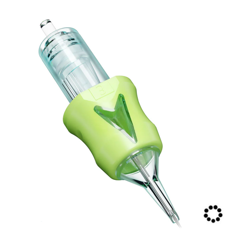 Řada OG Produce Arrow Shader 9 je určená pro tatéry, kteří potřebují kontrolu při stínování a při vyplňování ploch. Úzká špička se šikmým zakončením pomáhá udržet směr tahu a podporuje rovnoměrný tok inkoustu, zatímco silikonový návlek tlumí nežádoucí vibrace. Dostupné průměry umožňují vybrat variantu podle požadovaného krytí a stylu tetování.