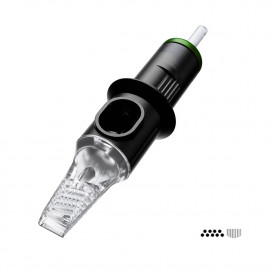 Inside the tip of the cartridge is a capillary style reservoir. During filling, Capillary Cartridges absorb more ink than conventional cartridges. The result is an up to 10 times longer ink flow before dipping into the ink cap. Color mixing in the cartridge and complete cleaning with water is still guaranteed. Improved needle guidance allows ultra-precise work in any direction. The Capillary Cartridges ensure that ink is evenly distributed on all individual needles, even in large configurations.