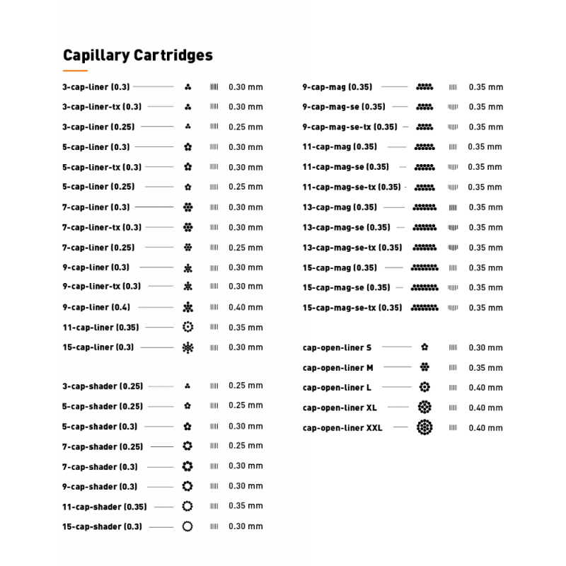 Inside the tip of the cartridge is a capillary style reservoir. During filling, Capillary Cartridges absorb more ink than conventional cartridges. The result is an up to 10 times longer ink flow before dipping into the ink cap. Color mixing in the cartridge and complete cleaning with water is still guaranteed. Improved needle guidance allows ultra-precise work in any direction. The Capillary Cartridges ensure that ink is evenly distributed on all individual needles, even in large configurations.