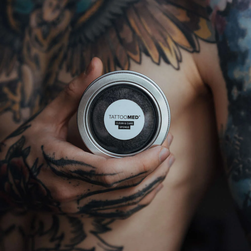 TattooMed® Clean & Care Sponge is a natural cleansing sponge made from konjac fibres and bamboo charcoal, designed for gentle washing of the skin without soap. It is suitable for tattoo artists, PMU and SMP professionals as a hygiene aid during the regeneration period, and for clients who appreciate gentle care for their tattoos' appearance.