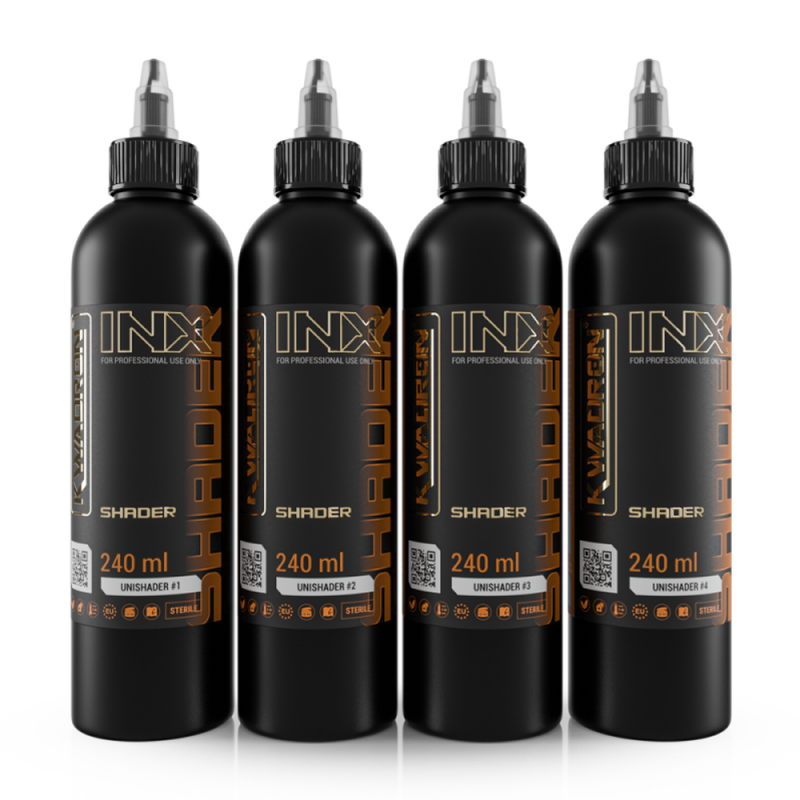 Kwadron Inx UniShader is a professional ink designed for tattoo artists who require precise control and a clean, natural-looking result. It is the second shade in a four-ink range, ready to use without mixing. It allows you to create smooth tonal transitions and build shadows on larger areas. It’s an ideal choice if you’re looking for a balance between softness and sharpness.