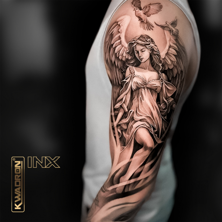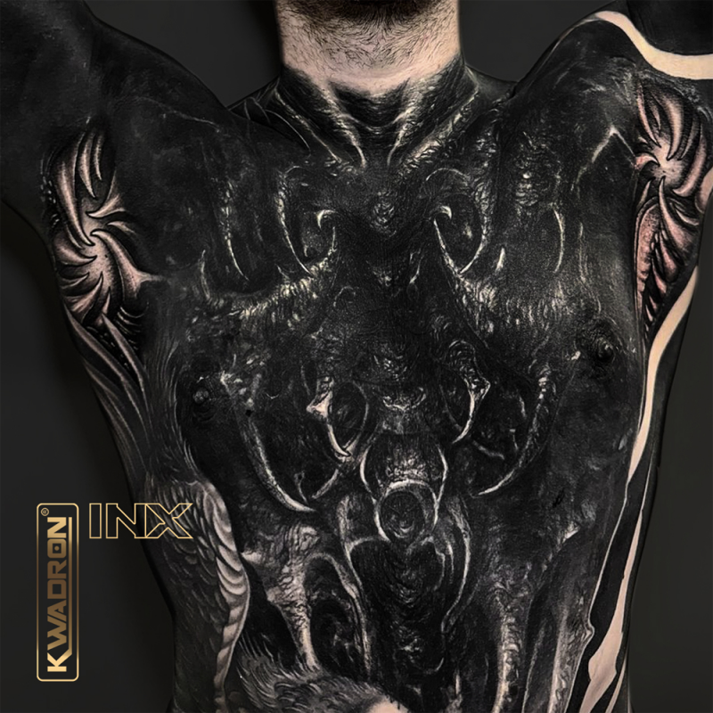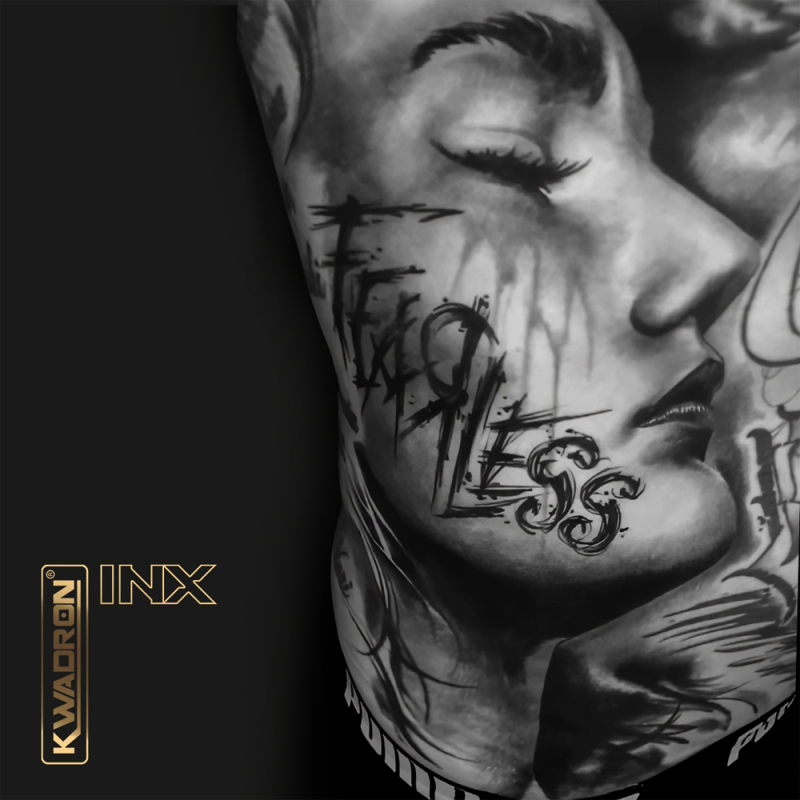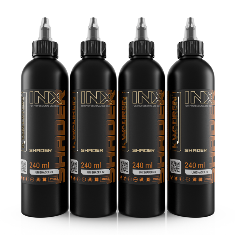 Kwadron Inx UniShader is a professional ink designed for tattoo artists who require precise control and a clean, natural-looking result. It is the fourth and darkest variant in a four-ink range, ready to use without mixing. It has the highest pigment concentration in this series, making it ideal for deep tones, solid black areas, and strong contrasts.