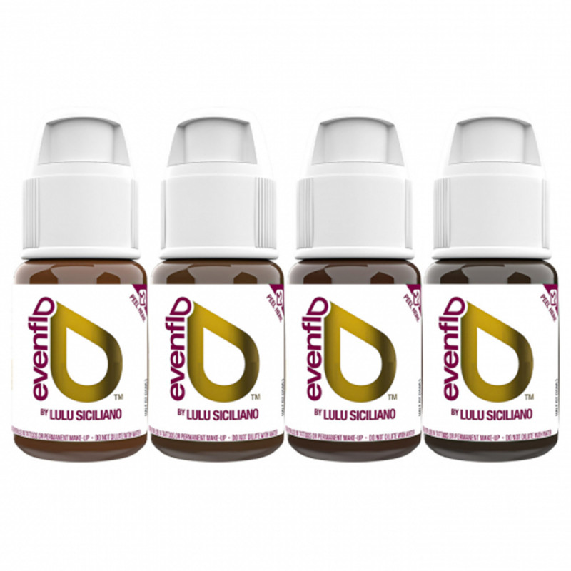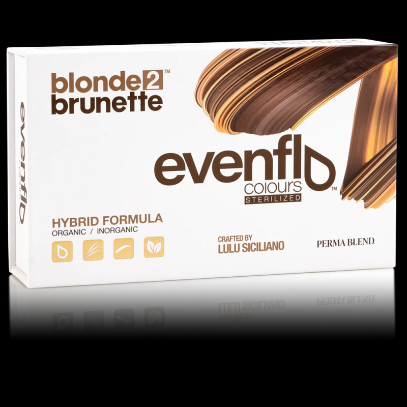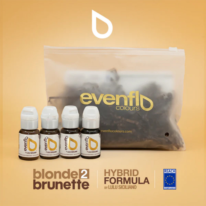 Rubia Brows je zo setu Evenflo Blonde 2 Brunette, ktorý bol vytvorený v spolupráci s Lulu Siciliano. Set obsahuje 4 odtiene farieb, ktoré sú vhodné pre všetky tóny pleti Fitzpatrick od 1 - 6. Vďaka organickým a anorganickým zložkám farby ľahko prenikajú do pokožky a vyblednú do neutrálneho tónu. Vylepšené zloženie farieb vytvára krásne mäkké a prirodzene zacelené obočie. Tieto odtiene je možné použiť samostatne alebo aj zmiešaním s inými PMU farbami pre tieňovanie, ombre, či na vytváranie ťahov vlasov.