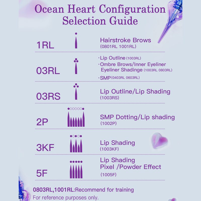 Rada Ocean Heart je vytvorená pre špecialistov na permanentný make-up a SMP, ktorí pracujú s drobnými detailmi a potrebujú stabilný pohyb. Úzka, predĺžená špička uľahčuje tvorbu malých bodov aj tenkých ťahov na obočí, viečkach a perách. Jednotlivé prevedenia sa líšia priemerom a počtom ihiel, takže si môžete vybrať riešenie zodpovedajúce konkrétnej metóde. Cartridge sú navrhnuté tak, aby umožňovali kontrolovaný tok pigmentu a minimalizovali podráždenie pokožky.