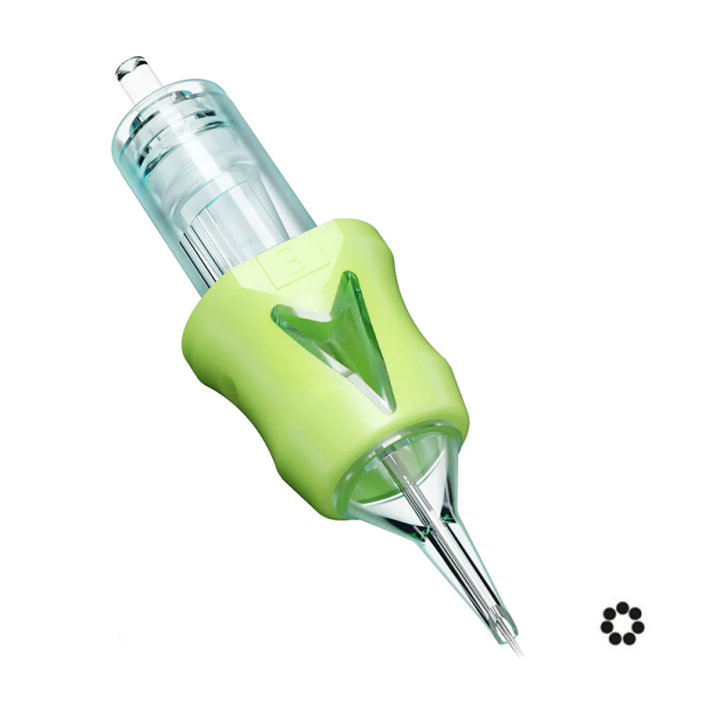 Rada OG Produce Arrow Shader 7 je určená pre tatérov, ktorí potrebujú kontrolu pri tieňovaní a pri vyplňovaní plôch. Úzka špička so šikmým zakončením pomáha udržať smer ťahu a podporuje rovnomerný tok atramentu, zatiaľ čo silikónový návlek tlmí nežiaduce vibrácie. Dostupné priemery umožňujú vybrať variantu podľa požadovaného krytia a štýlu tetovania.